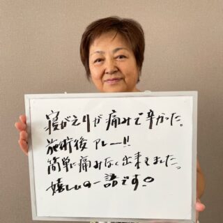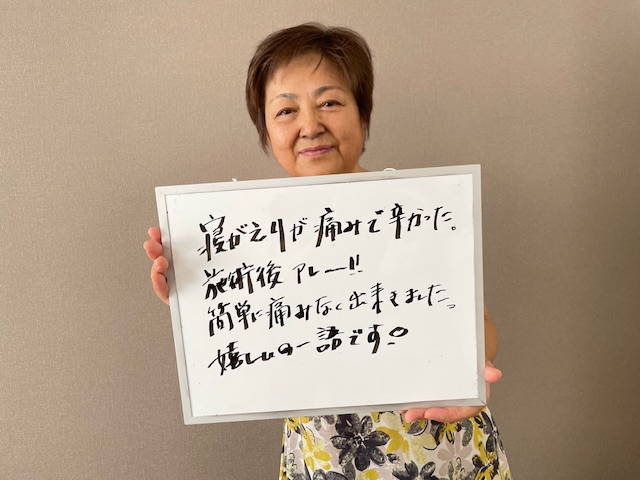 ゴキゴキ鳴って、腫れた膝は曲がりませんでしたが、今では散歩を始めたり体が楽に動けることを楽しんでいます。最近よく周りの人から姿勢がキレイになったと声をかけられて嬉しいです。